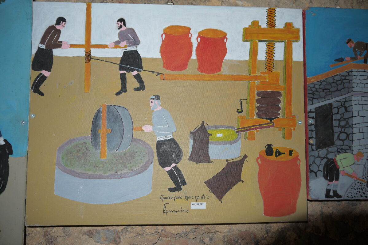 They placed a large millstone, and its axle was supported on one end by a wooden post standing upright in the middle of the base. The other end of the axle extended outward, and a man would push it with his chest and hands, turning the millstone to crush the olives. The part of the axle that extended out was called the “stavari.” Another person would throw the olives in, little by little.