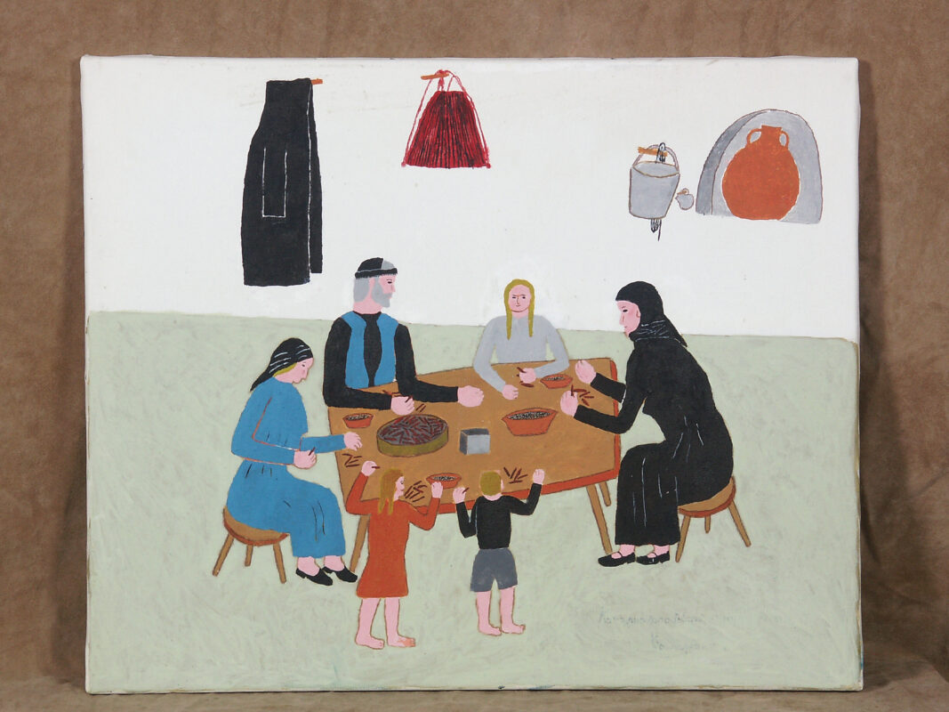 THE FAMILY SITTING TOGETHER SHARES A SIMPLE SUPPER OF CAROB PODS AND OLIVES