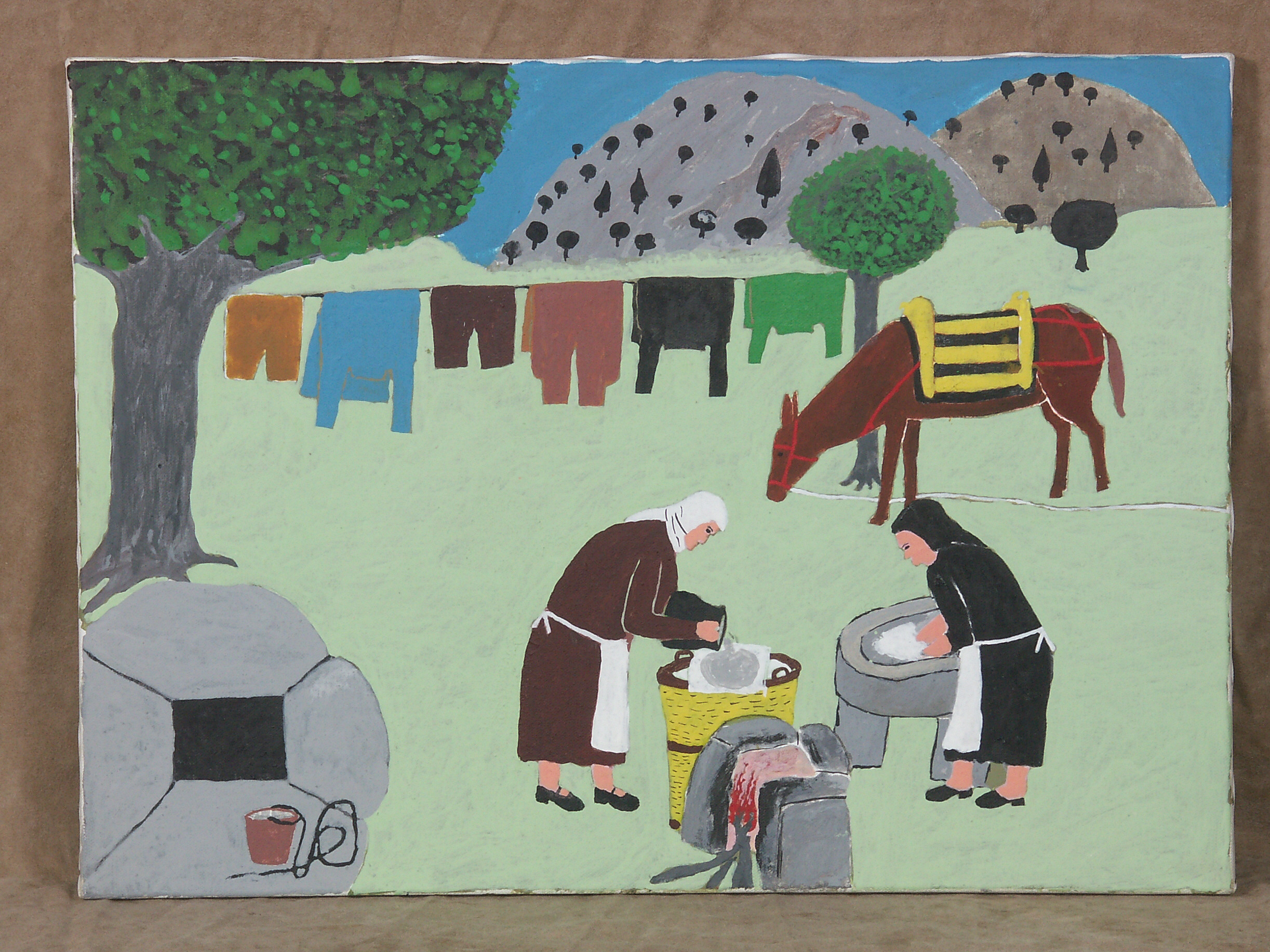φόρτωνε η γυναίκα το πρωί στο γάιδαρο τα ρούχα, τα ξύλα, το μπουγαδοκόφινο, το τσικάλι για να ζεσταίνει το νερό, το σαπούνι που η ίδια είχε φτιάξει, στάχτη για να τα “λευκάνει” και βέβαια το “πλυστροπίνακο” 164 (τη σκάφη του πλυσίματος) και άμα ήτανε πολλή δουλειά, έπαιρνε και το φαΐ της.