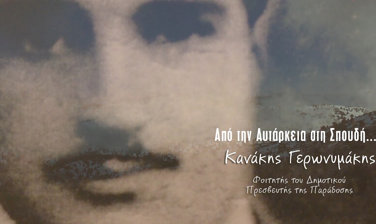 Στη ζωή που βιώνουμε, παρατηρώντας το σύνολο της, μπορεί κανείς να διαπιστώσει πως τίποτα δεν συνεχίζεται ή δεν επιβιώνει χωρίς αφετηρία, χωρίς ρίζα. Επίσης, η τεχνολογία, η επιστήμη, χωρίς την τέχνη είναι στείρα. Η παράδοση, είναι η αφετηρία, η ρίζα της τέχνης και του πολιτισμού. Το ντοκιμαντέρ «Από την αυτάρκεια στη σπουδή, Κανάκης Γερωνυμάκης. Φοιτητής του δημοτικού, πρεσβευτής της παράδοσης», είναι ένα ευχαριστώ στον άνθρωπο που σεβάστηκε, εκτίμησε και μας δώρισε με το έργο του τις αξίες της ζωής, που δυναμώνουν τις ρίζες και την αφετηρία της και συντελούν στην υγιή ανάπτυξη και αέναη εξέλιξη των επόμενων γενεών.